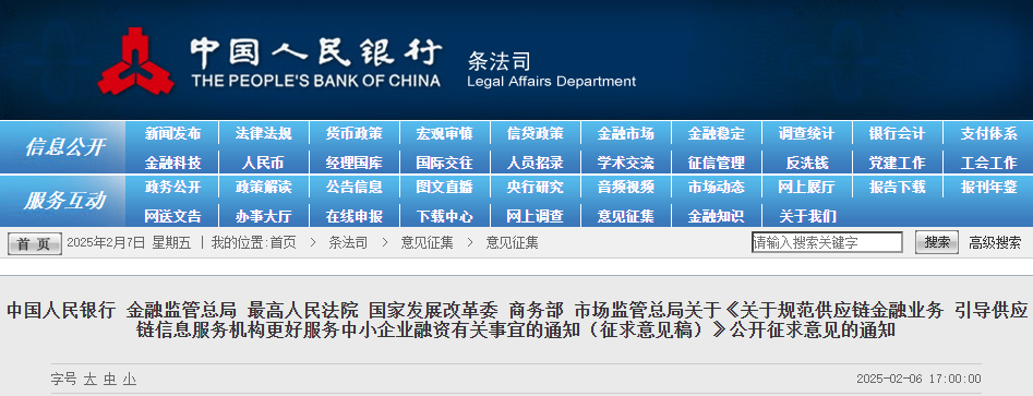 近日,中国人民银行会同金融监管总局、最高人民法院、国家发展改革委、商务部、市场监管总局起草了《关于规范供应链金融业务 引导供应链信息服务机构更好服务中小企业融资有关事宜的通知(征求意见稿)》,并向社会公开征求意见。