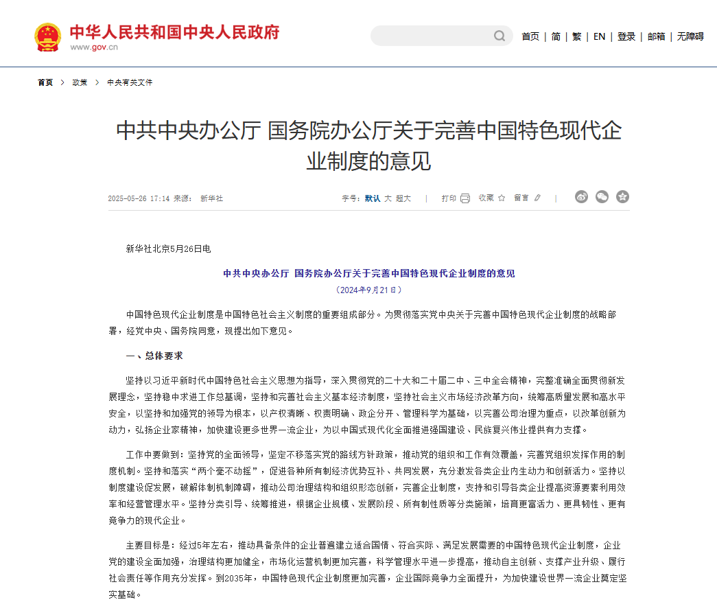 5月26日,中共中央办公厅、国务院办公厅发布《关于完善中国特色现代企业制度的意见》(以下简称意见)。《意见》共8个部分、19条具体举措,从多方面作出全面系统部署,重在以制度创新赋能企业发展,进一步释放微观主体活力,培育更富活力、更具韧性、更有竞争力的现代企业。