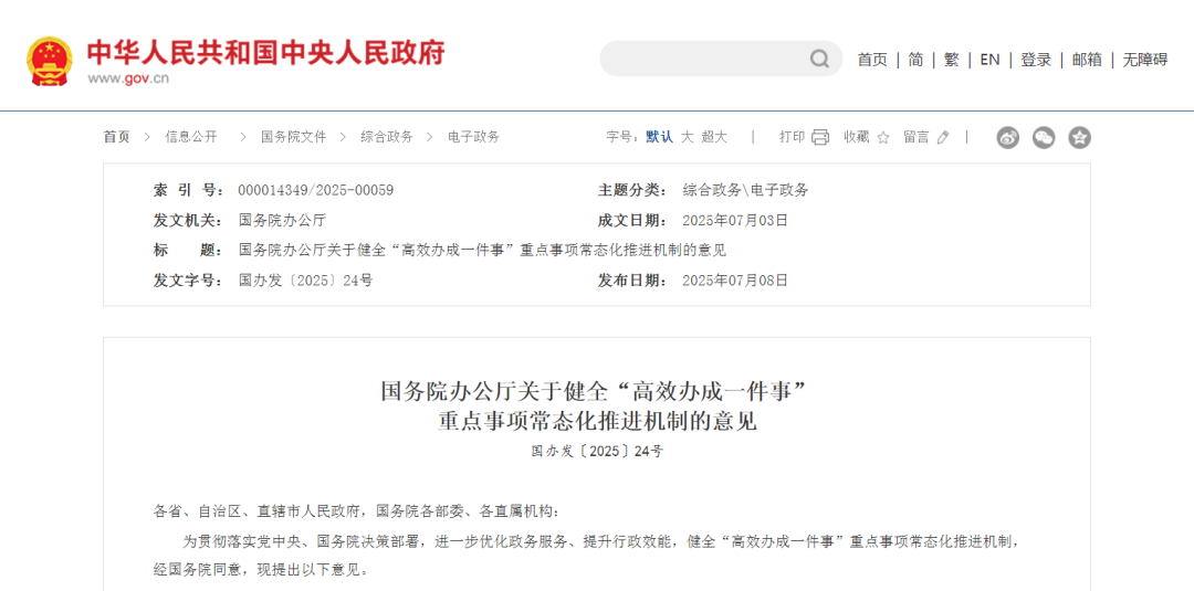 为贯彻落实党中央、国务院决策部署,进一步优化政务服务、提升行政效能,健全“高效办成一件事”重点事项常态化推进机制,近日,国务院办公厅发布《关于健全“高效办成一件事”重点事项常态化推进机制的意见》。
