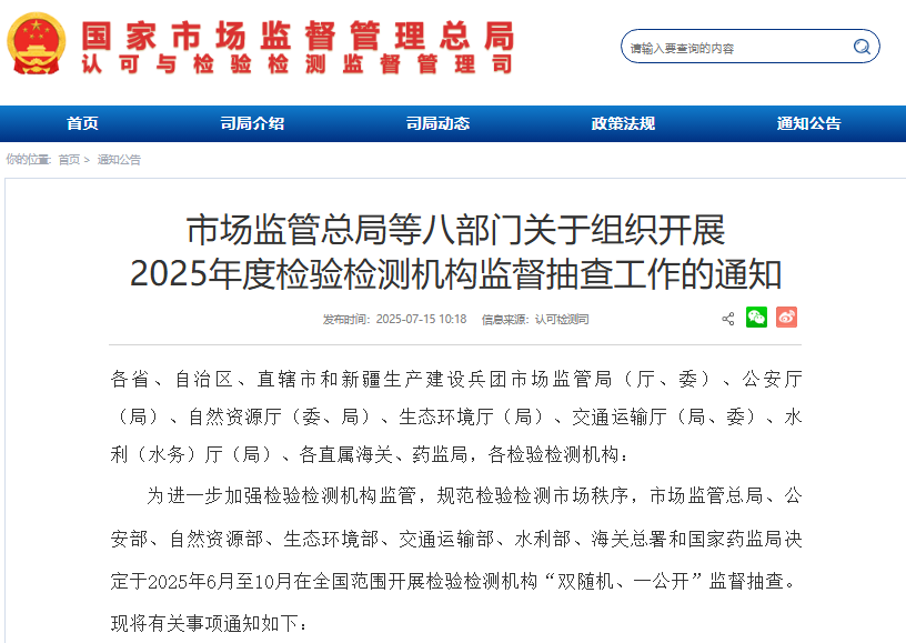 为进一步加强检验检测机构监管,规范检验检测市场秩序,市场监管总局、公安部、自然资源部、生态环境部、交通运输部、水利部、海关总署和国家药监局决定于2025年6月至10月在全国范围开展检验检测机构“双随机、一公开”监督抽查。现将有关事项通知如下: