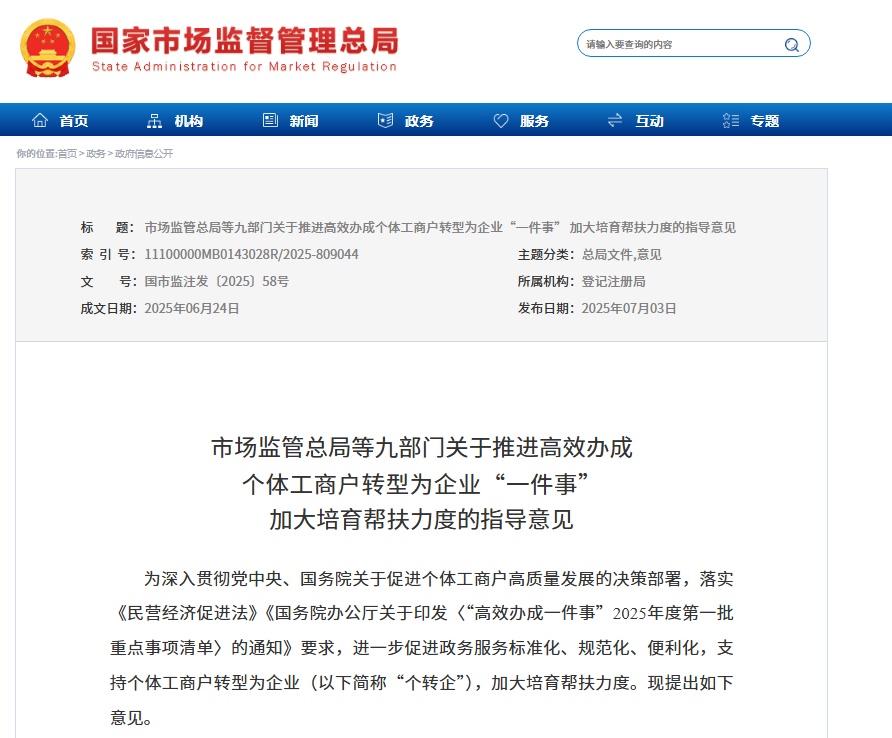 为深入贯彻党中央、国务院关于促进个体工商户高质量发展的决策部署,落实《民营经济促进法》《国务院办公厅关于印发〈“高效办成一件事”2025年度第一批重点事项清单〉的通知》要求,进一步促进政务服务标准化、规范化、便利化,支持个体工商户转型为企业(以下简称“个转企”),加大培育帮扶力度。现提出如下意见。