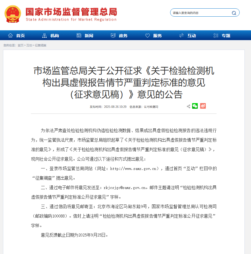 8月26日,为依法严肃查处检验检测机构伪造检验检测数据、结果或出具虚假检验检测报告的违法违规行为,统一监管执法尺度,市场监管总局组织起草了《关于检验检测机构出具虚假报告情节严重判定标准的意见》,形成了《关于检验检测机构出具虚假报告情节严重判定标准的意见(征求意见稿)》,现向社会公开征求意见。