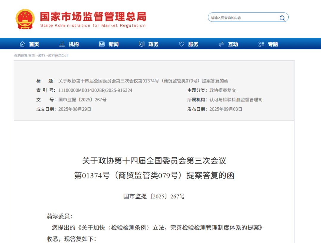 近日,市场监管总局公布了对政协第十四届全国委员会第三次会议第01374号提案的答复,全面回应了蒲淳委员提出的《关于加快〈检验检测条例〉立法,完善检验检测管理制度体系的提案》。