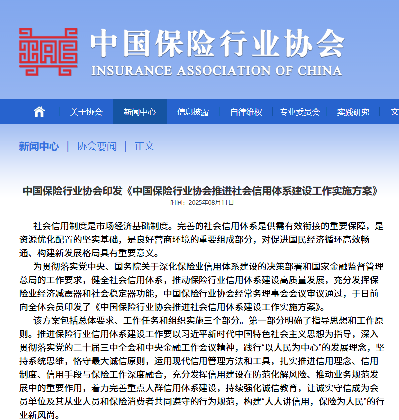 中国保险行业协会:印发《中国保险行业协会推进社会信用体系建设工作实施方案》