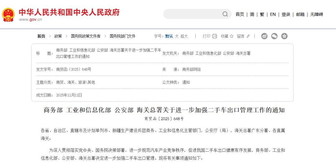 为深入贯彻落实党中央、国务院决策部署,进一步规范汽车产业竞争秩序,促进我国二手车出口健康有序发展,商务部、工业和信息化部、公安部、海关总署决定进一步加强二手车出口管理。现将有关事项通知如下: