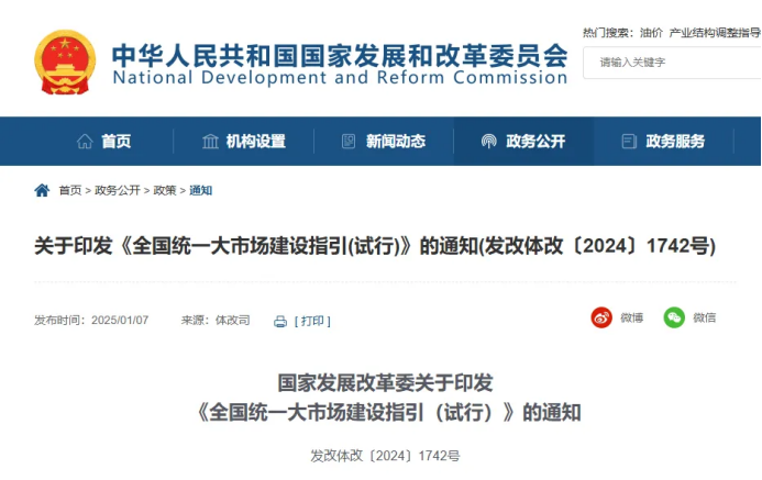 8月1日,国家发改委召开国家发展改革委新闻发布会,解读当前经济形势和经济工作,表示下一步将重点实现产权保护、市场准入、公平竞争、社会信用、质量标准等制度的统一。进一步规范政府行为尺度,制定《妨碍统一市场和公平竞争行为防范事项清单》。推动健全有利于市场统一的财税体制、统计核算制度和考核评价体系。
