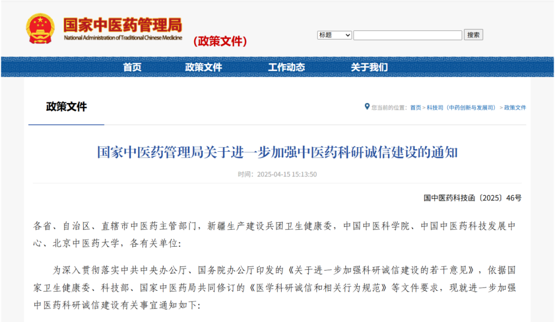 4月15日,为深入贯彻落实中共中央办公厅、国务院办公厅印发的《关于进一步加强科研诚信建设的若干意见》,依据国家卫生健康委、科技部、国家中医药局共同修订的《医学科研诚信和相关行为规范》等文件要求,国家中医药管理局印发《关于进一步加强中医药科研诚信建设的通知》,从10个方面对中医药科研诚信建设进行了明确规范。