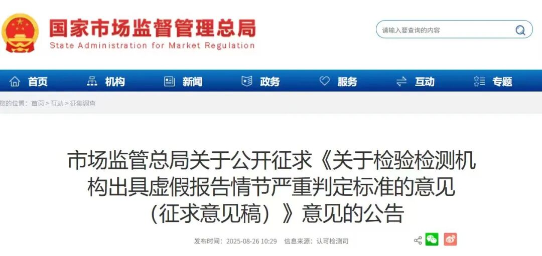 8月26日,为依法严肃查处检验检测机构伪造检验检测数据、结果或出具虚假检验检测报告的违法违规行为,统一监管执法尺度,市场监管总局发布《关于检验检测机构出具虚假报告情节严重判定标准的意见(征求意见稿)》。构成犯罪被依法追究刑事责任、2年内因出具虚假报告受过1次行政处罚又再次出具虚假报告、出具虚假报告10份以上,以及造成重大安全事故、重大环境影响或者引发严重社会影响等五种情形将被认定为情节严重,列入严重违法失信名单。