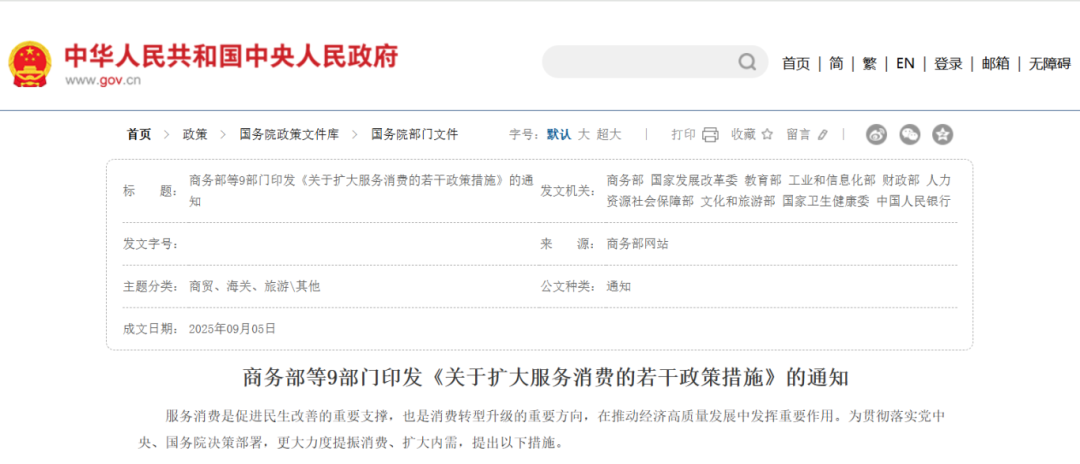 9月5日,商务部等9部门联合印发《关于扩大服务消费的若干政策措施》,提出5方面19条具体任务措施。其中包括:综合运用货币信贷等政策工具,支持金融机构扩大服务消费领域信贷投放,加大对服务消费领域经营主体信贷投放力度。加大消费信贷支持力度。支持地方通过新设或纳入现有风险补偿专项资金等方式,分担消费信贷风险,开展重点领域消费贷款贴息,引导金融机构和商家合作开发适合服务消费特点的产品和服务,形成“政府补贴+金融支持+商家优惠”组合拳。