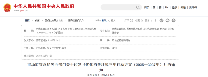 市场监管总局、国家发改委、工业和信息化部、商务部、文化和旅游部联合印发《优化消费环境三年行动方案(2025—2027年)》。《行动方案》明确了5方面19项重点任务,着力破除消费者反映突出的痛点难点问题,提振消费信心、激发市场活力、维护群众利益,全面建设诚信、公平、便捷、安全的消费环境。