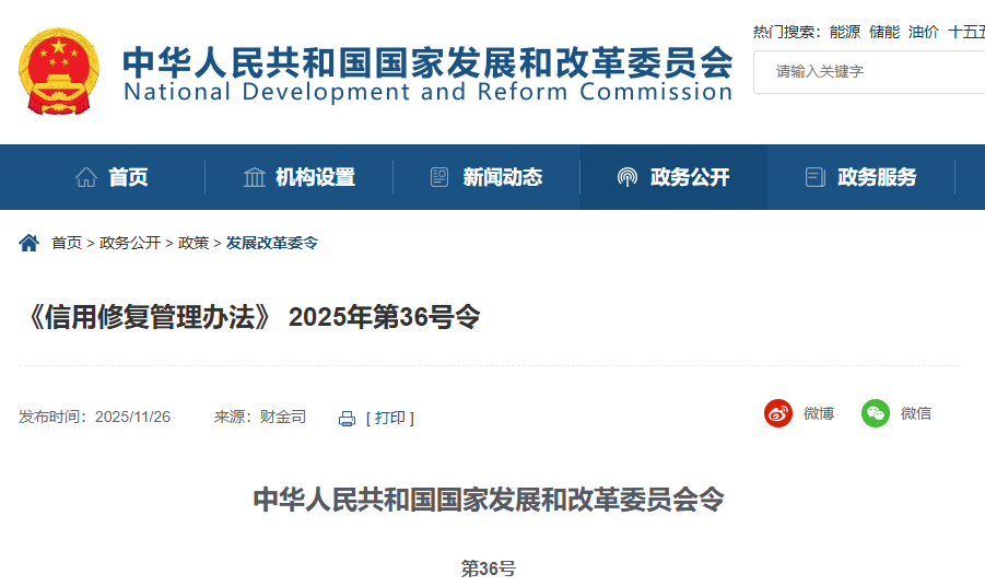 11月26日,国家发改委发布《信用修复管理办法》,《办法》自2026年4月1日起施行。《办法》从明确分类标准、优化办理流程、加强协同联动三个方面入手,推动建立以“信用中国”网站为统一总窗口的协同机制,实现失信信息的精准分类、修复办理流程的标准化、修复结果的全国同步更新,帮助信用主体依法依规、高效便捷重塑信用,切实保障信用主体合法权益。
