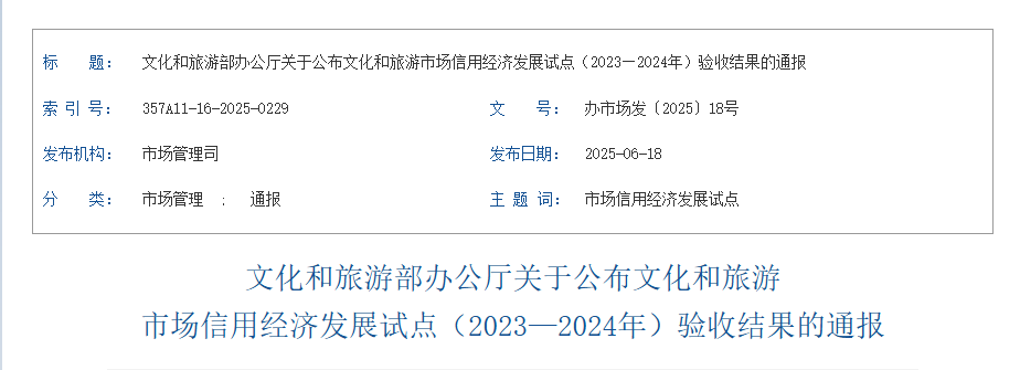 6月7日,文化和旅游部办公厅发布《文化和旅游部办公厅关于公布文化和旅游市场信用经济发展试点(2023—2024年)验收结果的通报》。文件指出,经综合评估,北京市海淀区、河北省邢台市任泽区、辽宁省沈阳市、吉林省长春新区、上海市徐汇区、江苏省无锡市、浙江省杭州市、安徽省合肥市蜀山区、福建省厦门市、江西省新余市、山东省青岛市、湖南省郴州市、海南省三亚市、重庆市渝中区、四川省甘孜藏族自治州稻城县、云南省红河哈尼族彝族自治州建水县等16个试点地区均通过验收。文件表示试点地区在试点工作中发挥积极性、主动性和创造性,在完善信用承诺制度、推进信用品牌建设、优化信用消费环境、促进信用信息共享、加强诚信文化建设方面形成和积累了一批典型经验做法,对助力当地文化和旅游市场高质量发展发挥了积极作用。