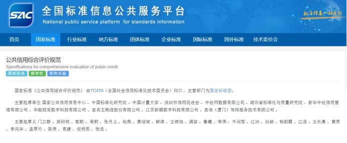 2月28日,由国家公共信用和地理空间信息中心、中国标准化研究院等单位联合起草的《公共信用综合评价规范》(GB/T 45255-2025)国家标准正式发布。国家标准《公共信用综合评价规范》 由TC470(全国社会信用标准化技术委员会)归口 ,主管部门为国家标准委。该标准从公共信用综合评价的总体原则、评价内容、评价等级表示方法及含义、评价周期、评价验证、评价应用等方面,规定了开展公共信用综合评价的技术要求,为各地区各部门推进公共信用综合评价及应用提供参考,对于加快构建以信用为基础的新型监管机制具有重要意义。