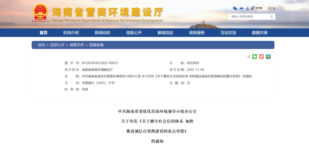 11月6日,海南省委优化营商环境领导小组办公室印发《关于健全社会信用体系 加快推进诚信自贸港建设的重点举措》,提出5方面共60项重点措施,加快推进诚信自贸港建设,让信用成为市场经济的“硬通货”,助力经济社会高质量发展。