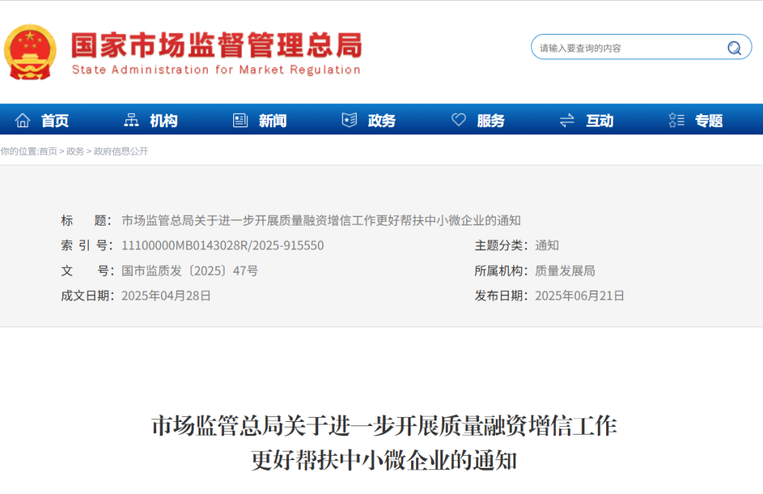 6月18日,市场监管总局发布《关于进一步开展质量融资增信工作更好帮扶中小微企业的通知》,明确采取更加有力措施,让质量融资增信工作更好惠及广大企业,更有效帮扶中小微企业走质量效益型道路。《通知》要求,各省级市场监管部门加快出台质量融资增信工作政策措施,推动定制开发质量融资增信专项产品,促进质量融资增信要素信息共享,优化质量融资增信办理服务,引导用好质量融资增信资金,持续创新推动质量融资增信工作,加强质量融资增信工作培训和宣传,加大质量融资增信工作保障力度。