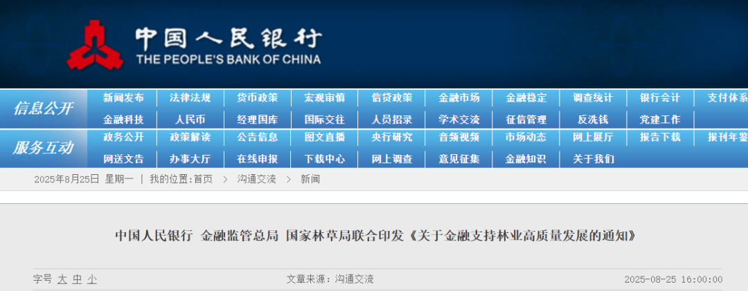 8月25日,中国人民银行、金融监管总局、国家林草局联合印发《关于金融支持林业高质量发展的通知》,提出稳步推行农户信用评价和林权抵押相结合的可循环信用贷款;各金融机构要加大金融科技投入,运用数字化技术优化信贷流程、信用评价和风险防控模型,提高生态产品价值融资的可得性、便利性和安全性;深入推进社会信用体系建设,搭建金融机构、担保机构、信用评级机构和政府部门共同参与的信用促进体系,通过信息共享、风险分担等机制,加强金融风险防范与管理。