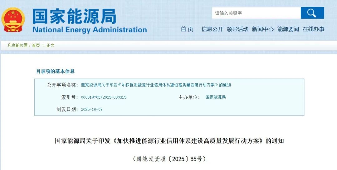 10月9日,国家能源局印发《加快推进能源行业信用体系建设高质量发展行动方案》。方案指出,坚持“政府引导、市场驱动、企业参与、行业自律、社会共建”原则,加强信用体系建设,营造诚信行业环境,到2027年底,能源行业信用法规制度体系和标准规范更加完善,信用信息归集共享质量显著提升,守信激励和失信惩戒机制高效运行,信用服务市场健康发展,行业诚信意识和信用水平普遍增强,信用成为加快建设全国统一大市场、维护公平有序竞争市场秩序、推动能源绿色低碳转型和高质量发展的重要支撑力量。