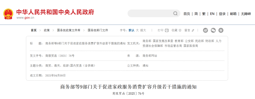 4月9日,商务部等9部门发布《关于促进家政服务消费扩容升级若干措施的通知》,围绕提升服务供给质量、促进便利消费、完善支持政策、优化消费环境4个方面提出12项重点举措。《通知》提出,加强家政服务信用体系建设,并在优化消费环境方面,强调“推进信用信息体系建设”。优化全国家政服务信用信息平台功能和服务,依法依规归集家政服务企业、家政服务员信用信息。加快“家政信用查”APP和小程序互联网全平台覆盖,实现“家政信用查”与地方家政信用信息平台互通。鼓励地方探索归集消费者对家政服务员的服务评价信息并依法依规进行展示。强化家政服务员信用核查,推行电子版“居家上门服务证”,依法依规向消费者展示家政服务员从业信息。