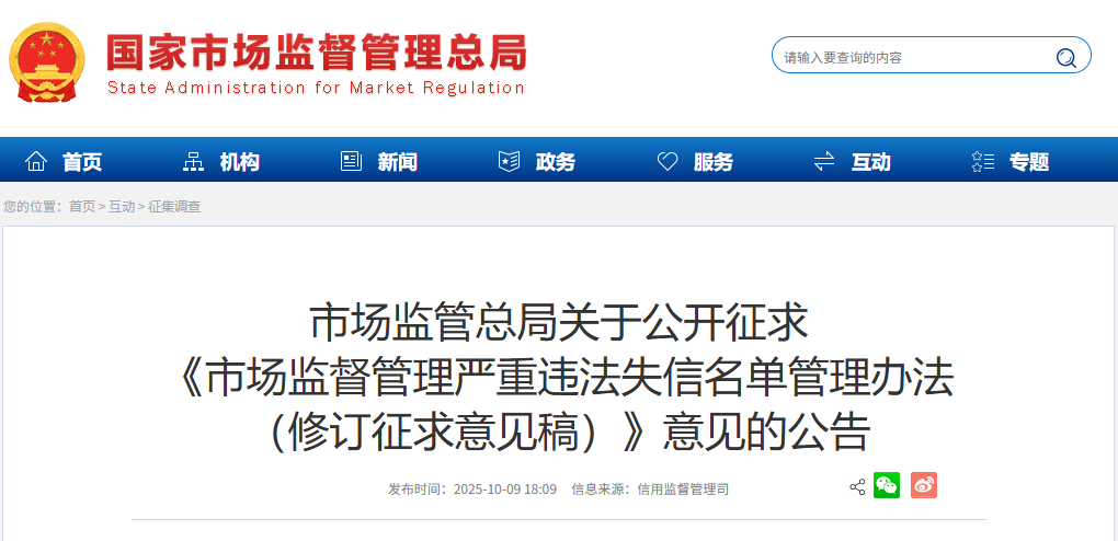 10月9日,国家市监总局就《市场监督管理严重违法失信名单管理办法(修订征求意见稿)》公开征求意见。根据《意见稿》规定,当事人违反法律、行政法规,性质恶劣、情节严重、社会危害较大,受到市场监督管理部门较重行政处罚的,由市场监督管理部门依照本办法规定列入严重违法失信名单,通过国家企业信用信息公示系统公示,并实施相应管理措施。这些较重行政处罚包括:依照行政处罚裁量基准,按照从重处罚原则处以罚款;降低资质等级,吊销许可证件、营业执照;限制开展生产经营活动、责令停产停业、责令关闭、限制从业;法律、行政法规和部门规章规定的其他较重行政处罚。