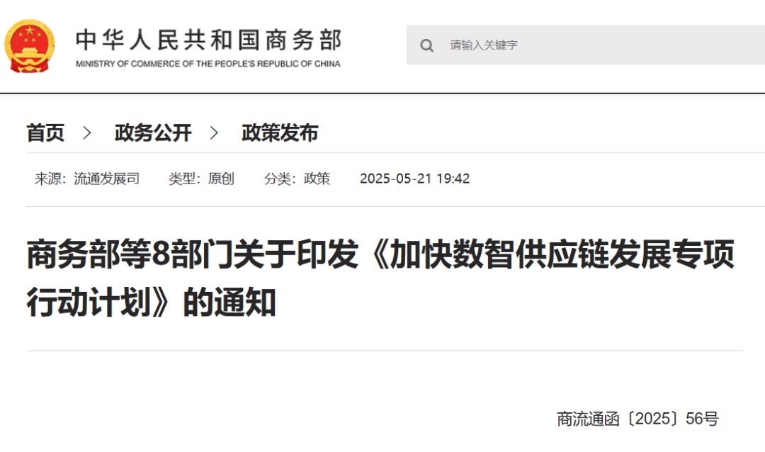 5月21日,商务部、国家发展改革委等8部门发布《加快数智供应链发展专项行动计划》,明确在农业、制造业、批发业、零售业等重点领域加快数智供应链发展,推动降低全社会物流成本,培育一批数智供应链领军企业和供应链中心城市。《行动计划》提到,建设数智供应链实验室、数智共享平台,加速数据流转和信息交互,为链上中小企业提供技术赋能、市场开拓、融资授信等支持,打造紧密耦合、高效协同的供应链集群。加强部门信息共享,建立供应链信用数据库,提供公共信用评价和风险预警服务,发挥行业自律机制作用,规范发展基于真实贸易的供应链金融。