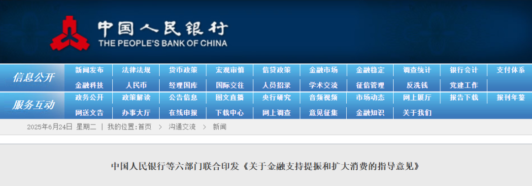 6月24日,中国人民银行、国家发展改革委、财政部、商务部、金融监管总局、中国证监会等六部门联合印发《关于金融支持提振和扩大消费的指导意见》。《意见》从支持增强消费能力、扩大消费领域金融供给、挖掘释放居民消费潜力、促进提升消费供给效能、优化消费环境和政策支撑保障等六个方面提出19项重点举措。