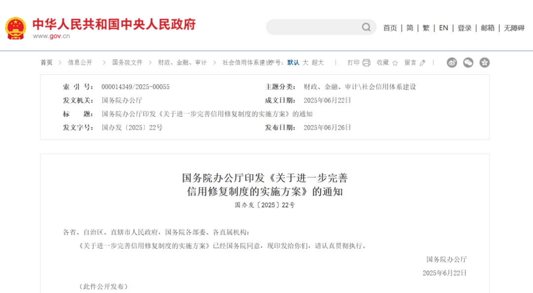 国务院办公厅印发《关于进一步完善信用修复制度的实施方案》