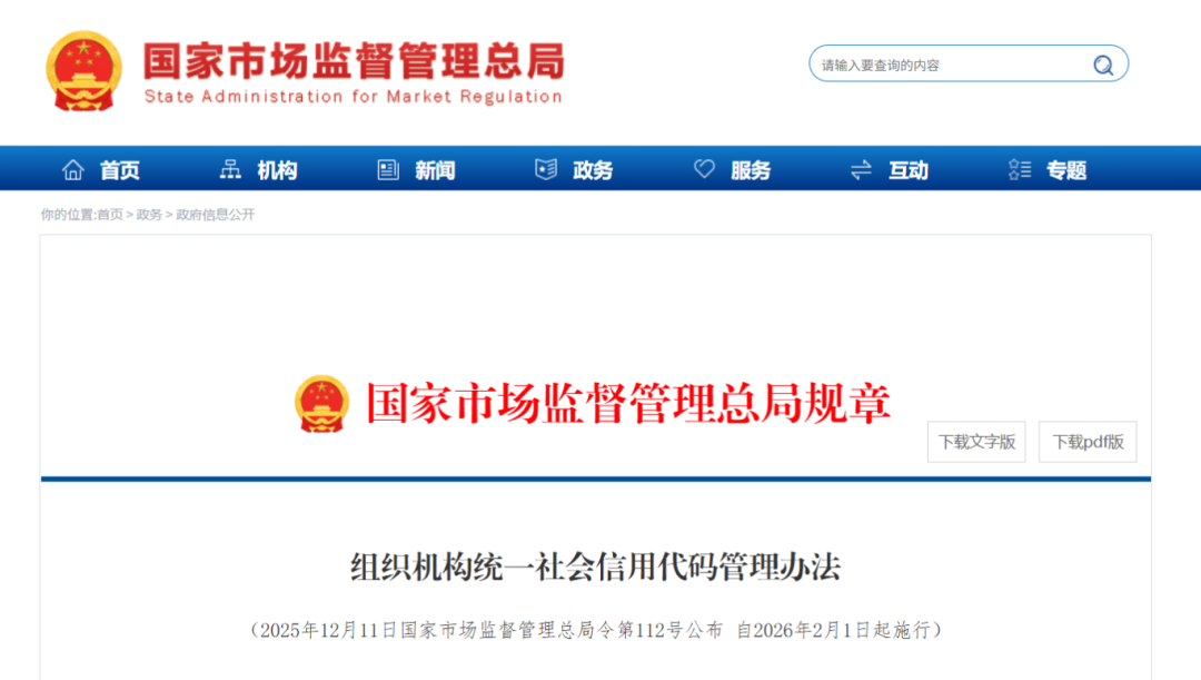 12月11日,市场监管总局对外发布《组织机构统一社会信用代码管理办法》。《办法》织密社会信用体系“数据网”。统一社会信用代码如金线穿珠,串起各地区、各部门的信用信息。以代码为索引,可全景记录经济活动,交叉稽核信用状况,真正做到“一处失信、处处受限”。