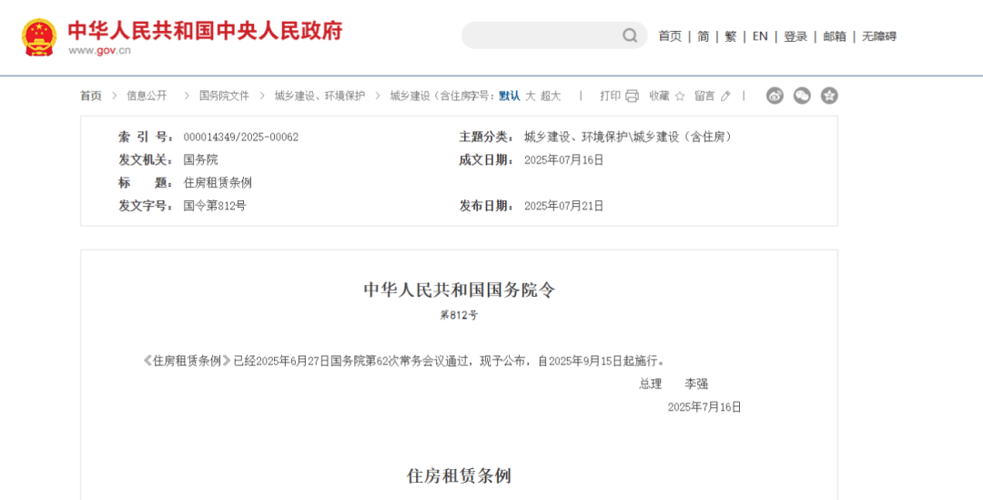 7月,国务院总理李强签署国务院令,公布《住房租赁条例》,自2025年9月15日起施行。《条例》共7章50条,旨在规范住房租赁活动,维护住房租赁活动当事人合法权益,稳定住房租赁关系,促进住房租赁市场高质量发展,推动加快建立租购并举的住房制度。《条例》明确,县级以上地方人民政府房产管理部门应当会同有关部门、住房租赁相关行业组织加强住房租赁行业诚信建设,建立住房租赁企业、住房租赁经纪机构及其从业人员信用评价制度,将相关违法违规行为记入信用记录,纳入全国信用信息共享平台,并根据信用状况实施分级分类监管。