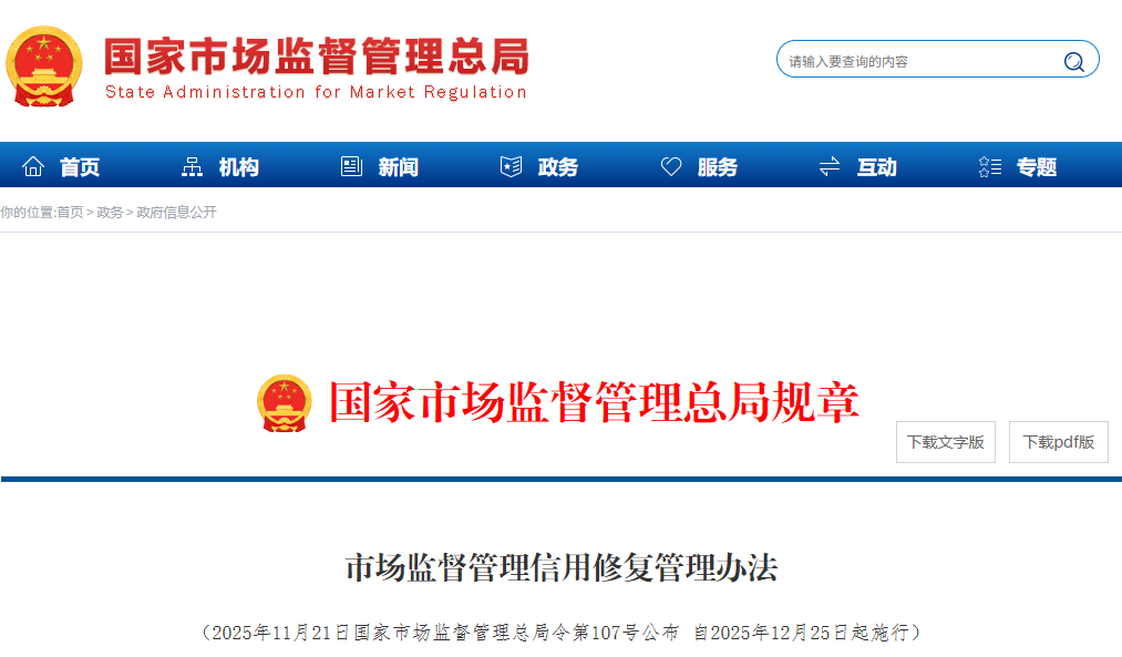 11月27日,市场监管总局印发《市场监督管理信用修复管理办法》,进一步健全信用修复制度,鼓励当事人主动纠正违法失信行为,重塑良好信用,《办法》将于12月25日起正式施行。《办法》贯彻落实国务院办公厅《关于进一步完善信用修复制度的实施方案》,进一步统一修复规则,增加了便民利企创新举措。