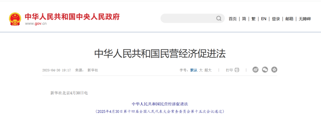 4月30日,十四届全国人大常委会第十五次会议表决通过了《中华人民共和国民营经济促进法》。法律共9章,包括总则、公平竞争、投资融资促进、科技创新、规范经营、服务保障、权益保护、法律责任、附则,自2025年5月20日起施行。作为我国第一部专门关于民营经济发展的基础性法律,民营经济促进法将进一步优化民营经济发展环境,保证各类经济组织公平参与市场竞争,促进民营经济健康发展和民营经济人士健康成长,构建高水平社会主义市场经济体制,发挥民营经济在国民经济和社会发展中的重要作用。