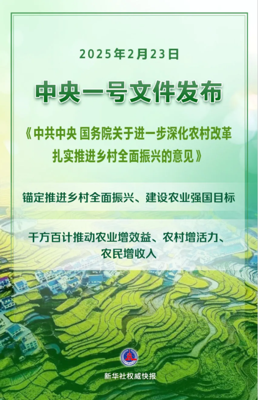 2月23日,《中共中央、国务院印发关于进一步深化农村改革 扎实推进乡村全面振兴的意见》即2025年中央一号文件发布。文件提出,深入推进农村信用体系建设,加强涉农信用信息归集共享。文件指出,以改革开放和科技创新为动力,巩固和完善农村基本经营制度,深入学习运用“千万工程”经验,确保国家粮食安全,确保不发生规模性返贫致贫,提升乡村产业发展水平、乡村建设水平、乡村治理水平,千方百计推动农业增效益、农村增活力、农民增收入,为推进中国式现代化提供基础支撑。