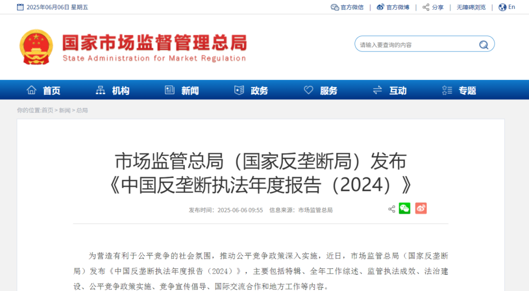 6月6日,市场监管总局(国家反垄断局)发布《中国反垄断执法年度报告(2024)》,主要包括特辑、全年工作综述、监管执法成效、法治建设、公平竞争政策实施、竞争宣传倡导、国际交流合作和地方工作等内容。报告指出,2024年,市场监管总局(国家反垄断局)牢牢把握加快建设全国统一大市场工作重点,加大重点领域反垄断监管执法力度,全年办结垄断协议、滥用市场支配地位案件11件,对1件拒绝、阻碍调查案件作出行政处罚,审结经营者集中案件643件;报请国务院颁布《公平竞争审查条例》,大力整治地方保护、市场分割突出问题,立案查处滥用行政权力排除、限制竞争案件72件;深化反垄断国际合作,与意大利等4个国家签署合作备忘录;举办全国公平竞争大会和中国公平竞争政策宣传周,积极为各类经营主体营造更加公平、更有活力的市场环境,推动经济高质量发展。