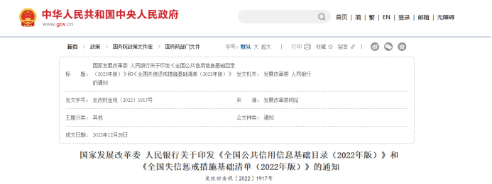 3月22日,为贯彻落实党中央、国务院关于推动社会信用体系高质量发展的决策部署,按照《中华人民共和国国民经济和社会发展第十四个五年规划和2035年远景目标纲要》《国务院办公厅关于进一步完善失信约束制度 构建诚信建设长效机制的指导意见》要求,国家发展改革委、中国人民银行会同社会信用体系建设部际联席会议成员单位和其他有关部门、单位,印发实施《全国公共信用信息基础目录(2025年版)》和《全国失信惩戒措施基础清单(2025年版)》。
