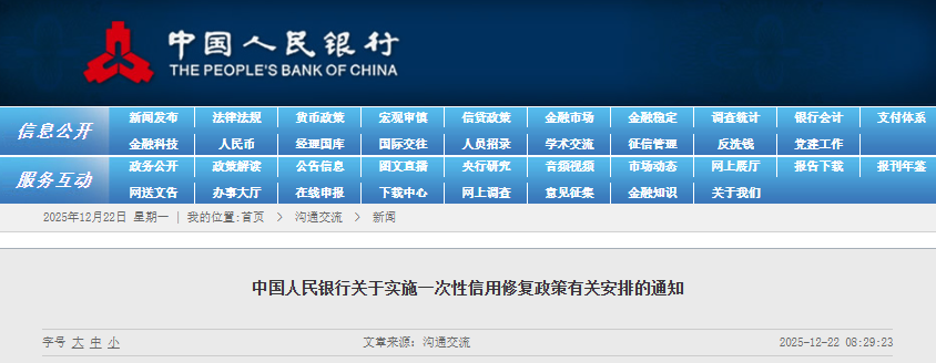 12月22日,中国人民银行发布通知,实施一次性信用修复政策,支持信用受损但积极还款的个人高效便捷重塑信用。对于2020年1月1日至2025年12月31日期间,单笔金额不超过10000元人民币的个人逾期信息,个人于2026年3月31日(含)前足额偿还逾期债务的,金融信用信息基础数据库将不予展示。