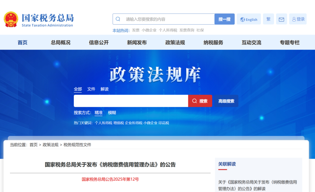 5月30日,国家税务总局发布《纳税缴费信用管理办法》,自2025年7月1日起施行。《办法》共六章三十六条,对纳税缴费信用的信息采集、评价指标、评价结果的确定和应用等内容作出明确规定。《办法》整合了2014年以来发布的纳税信用管理规范性文件以及相关规定,在保持评价制度和评价结果基本稳定的同时,聚焦经营主体反映的热点诉求,旨在进一步优化税务领域信用建设工作,促进企业合规经营,以此更好服务经济社会高质量发展。
