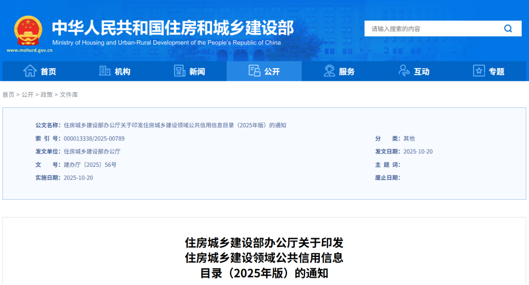 《住房城乡建设领域公共信用信息目录(2025年版)》正式出台