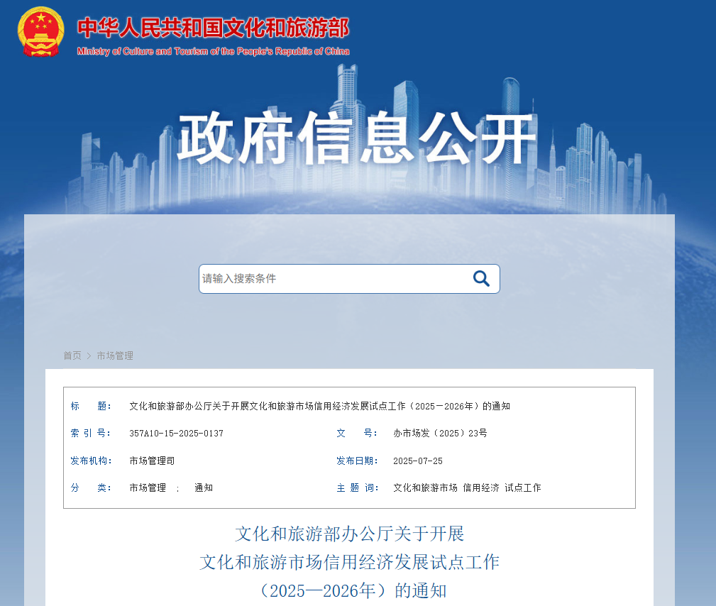 7月25日,文旅部发布通知,决定在全国范围内开展2025—2026年文化和旅游市场信用经济发展试点工作。这是继前两批试点后,文旅部第3次部署开展信用经济专项试点。