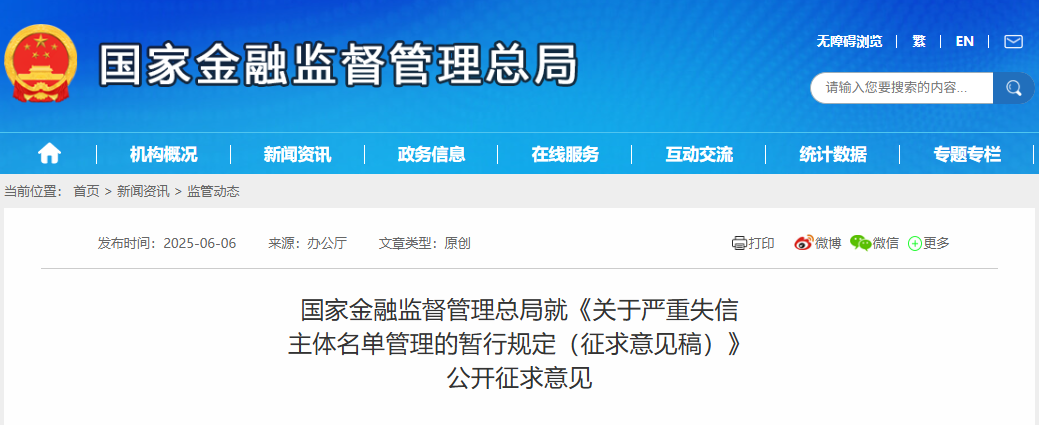 6月6日,金融监管总局起草了《关于严重失信主体名单管理的暂行规定(征求意见稿)》,并向社会公开征求意见。《暂行规定》共三十一条,主要包括以下内容:审慎界定名单列入范围。金融机构及其从业人员等主体受到金融监管总局或其派出机构行政处罚或监管强制措施,且性质特别恶劣、情节特别严重,严重破坏市场公平竞争秩序和社会正常秩序的,依照《暂行规定》列入严重失信主体名单。明确对严重失信主体的管理措施。依据有关法律法规和党中央、国务院政策文件,规定了金融监管总局及其派出机构对被列入名单的严重失信主体可以采取的管理措施。严格规范名单管理程序。对列入、移出名单的具体程序进行了规定,明确了列入名单满3年将移出名单并解除管理措施。同时规定了事先告知、异议处理等程序,充分保障相关主体知情权、申辩权。建立信用修复机制。鼓励严重失信主体纠正失信行为、消除不良影响,列入名单满1年可按规定申请提前移出,明确了提前移出条件、审核期限等。