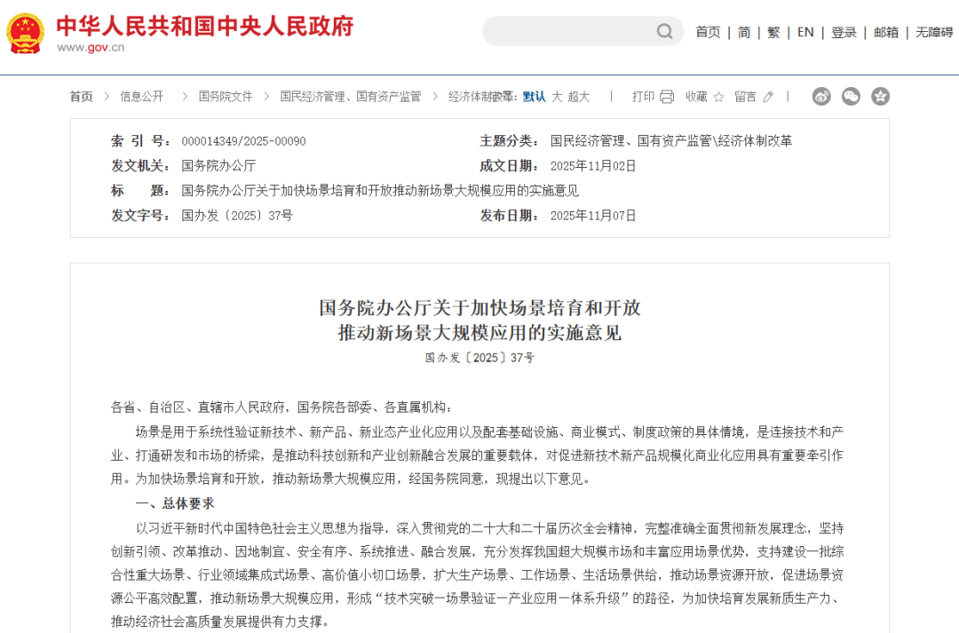 11月7日,国务院办公厅印发《关于加快场景培育和开放推动新场景大规模应用的实施意见》,对相关工作作出部署。《意见》指出,场景是用于系统性验证新技术、新产品、新业态产业化应用以及配套基础设施、商业模式、制度政策的具体情境,是连接技术和产业、打通研发和市场的桥梁,是推动科技创新和产业创新融合发展的重要载体,对促进新技术新产品规模化商业化应用具有重要牵引作用。《意见》中涉及“信用”的内容: