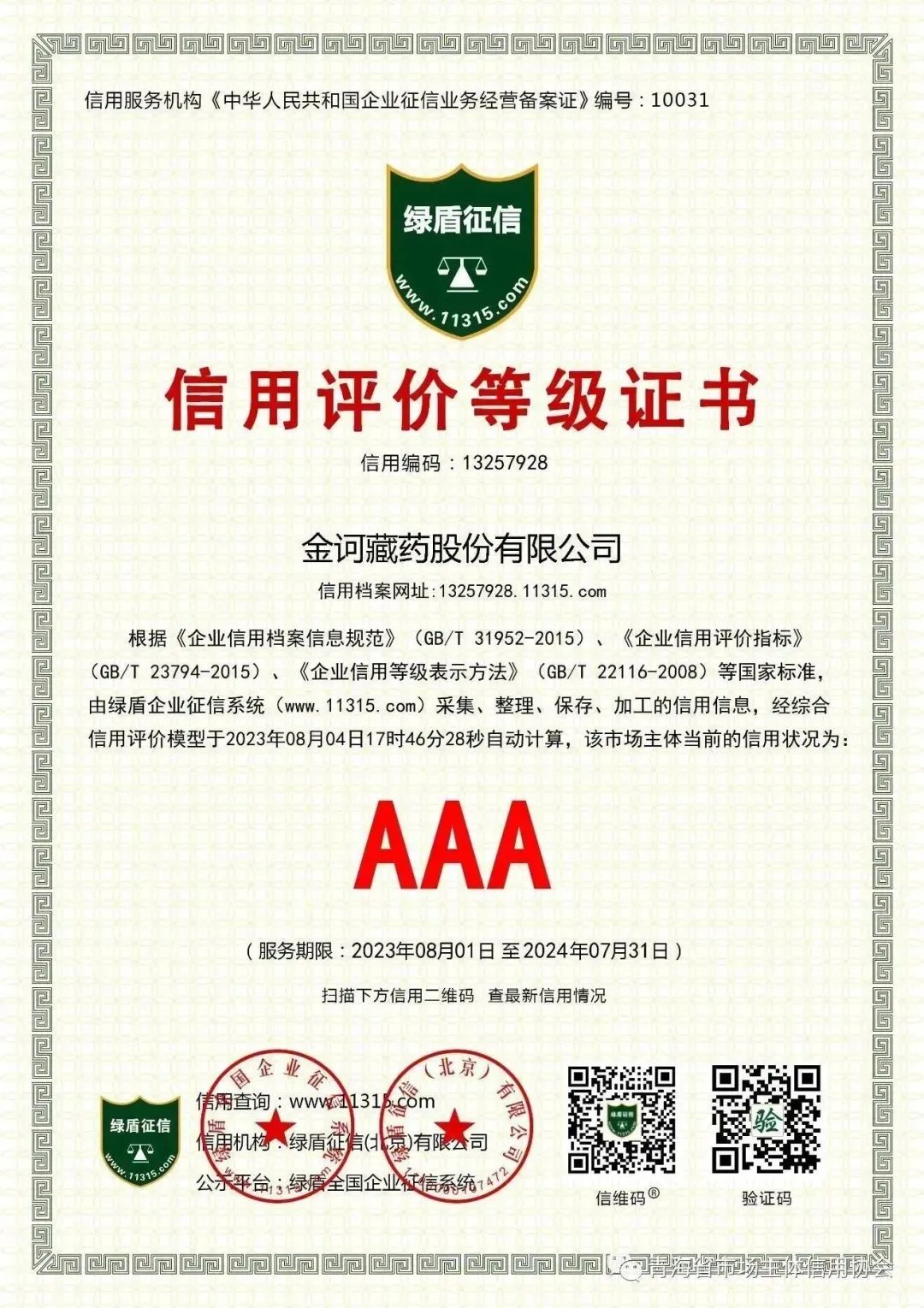 企业信用是整个社会信用体系建设的基础,在全面深化改革、体制转轨和社会转型新时期,金诃藏药股份有限公司不断加强企业诚信建设,提高企业诚信度,作为青海省市场主体信用协会的副会长单位,金诃藏药表示将积极担当、主动作为,带头推进全省信用体系建设。