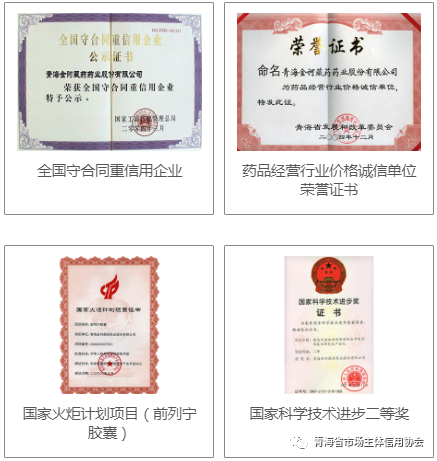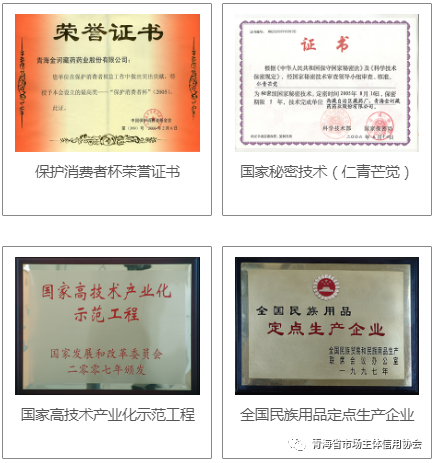 金诃藏药于2013年在青海省率先整厂通过2010年版《药品生产质量管理规范》认证,拥有2项“国家级非物质文化遗产”项目,先后获得“国家重合同守信用企业”、“中国驰名商标”、“国家创新型企业”、“国家地理标志保护产品”、“高新技术企业”、“企业国家重点实验室”和“GMP自检员实训基地” 等多项荣誉称号。