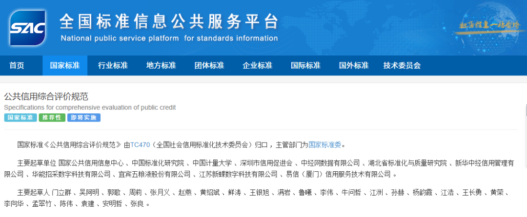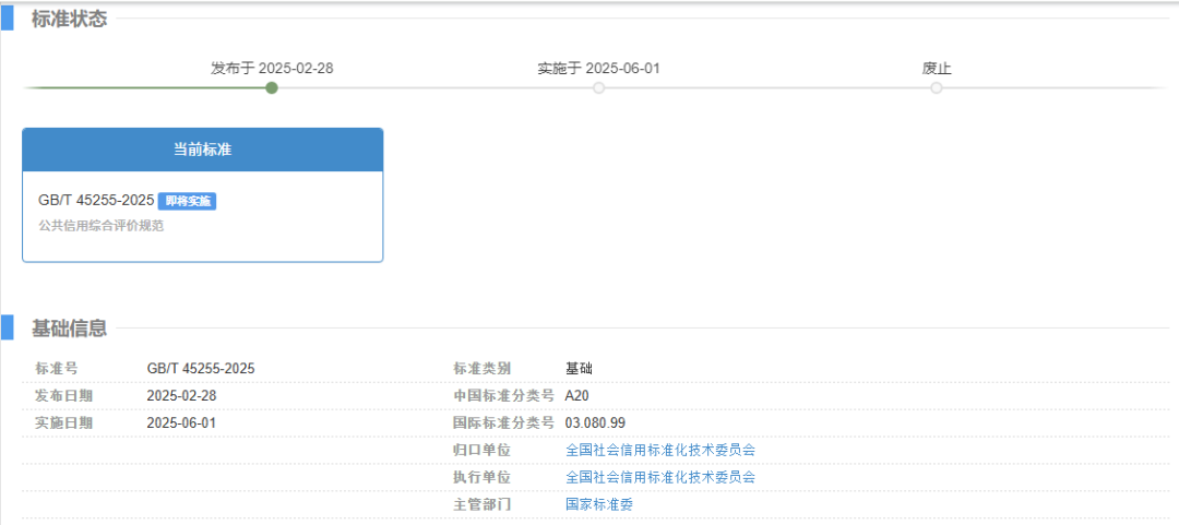 国家标准《公共信用综合评价规范》 由TC470(全国社会信用标准化技术委员会)归口 ,主管部门为国家标准委。该标准于2025年2月28日发布,将于2025年6月1日正式实施。