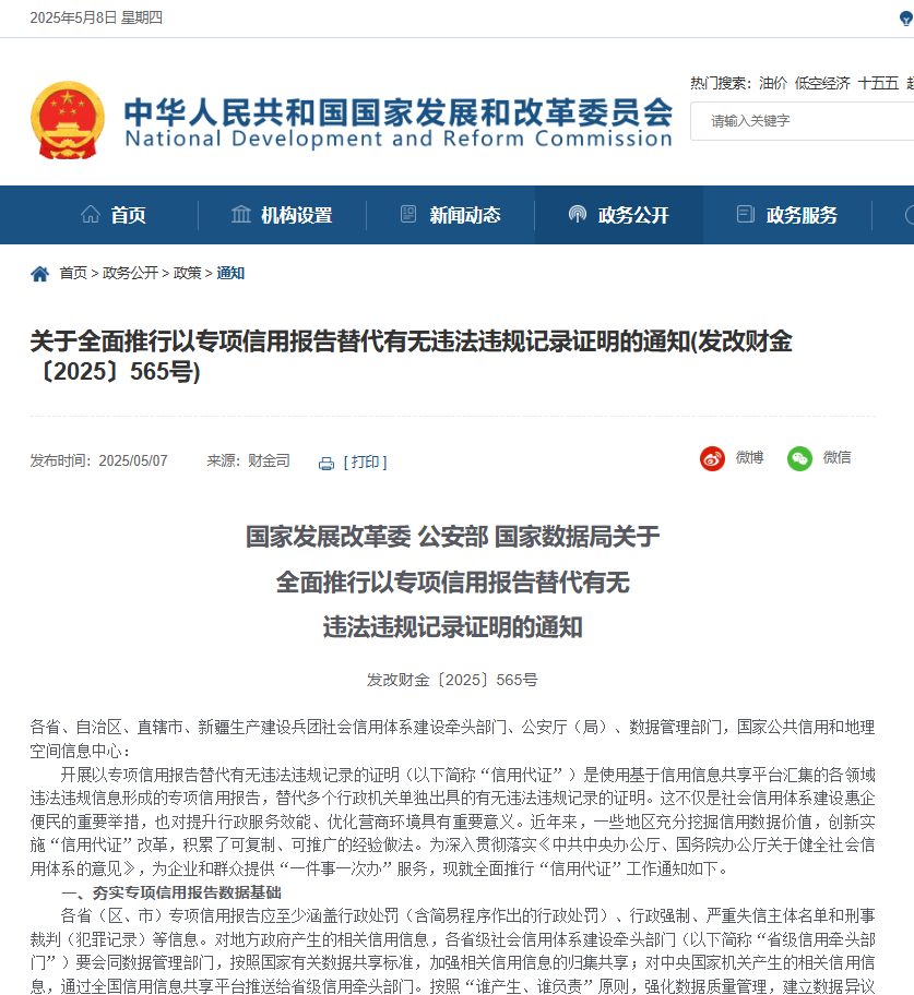 重磅!国家发改委发布《全面推行以专项信用报告替代有无 违法违规记录证明的通知》