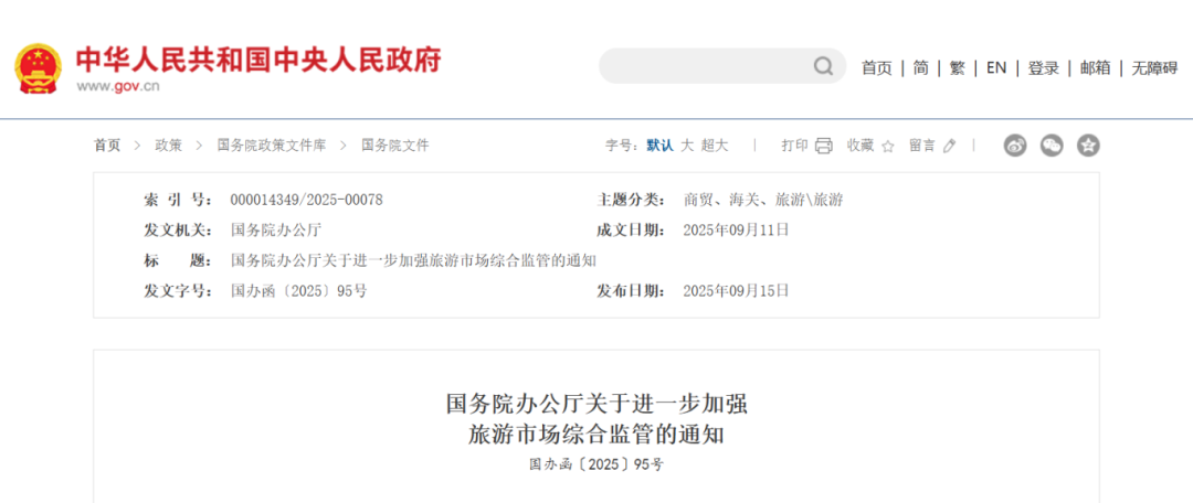 9月15日,国务院办公厅发布《国务院办公厅关于进一步加强旅游市场综合监管的通知》,明确“提升信用监管效能。健全旅游市场信用体系和监管制度。完善行业信用记录,依法依规开展失信主体认定,推进信用承诺、信用评价、信用修复等工作,实施分级分类监管。加强部门间信用信息共享,健全守信激励和失信惩戒机制。拓展旅游市场信用应用场景,发展信用经济。大力弘扬诚信文化。发挥行业组织作用。加强行业组织建设,鼓励行业组织积极参与权益保护、信用建设、质量提升等工作。”“推动加强行业自律,通过开展业务培训、加强宣传引导、选树正面典型等方式,引导旅游经营者依法依规诚信经营,共同维护旅游市场秩序。”
