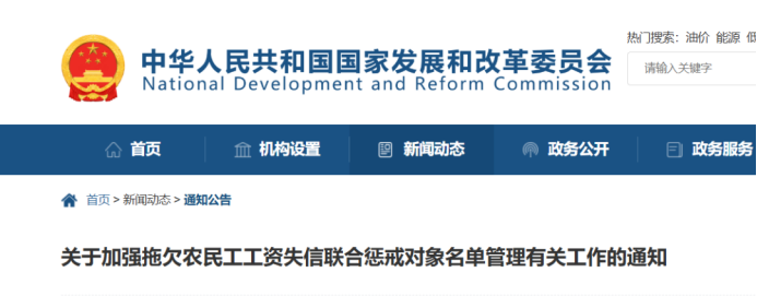 国家发改委等部门:加强拖欠农民工工资失信联合惩戒对象名单管理